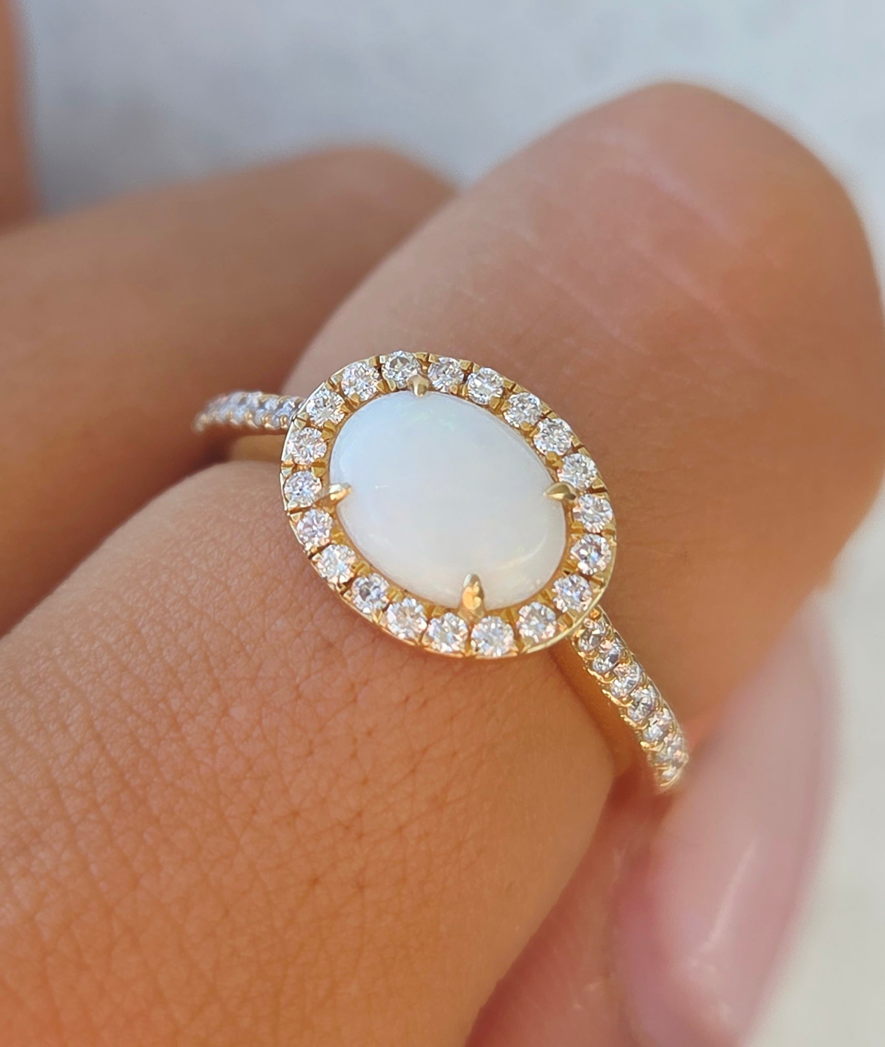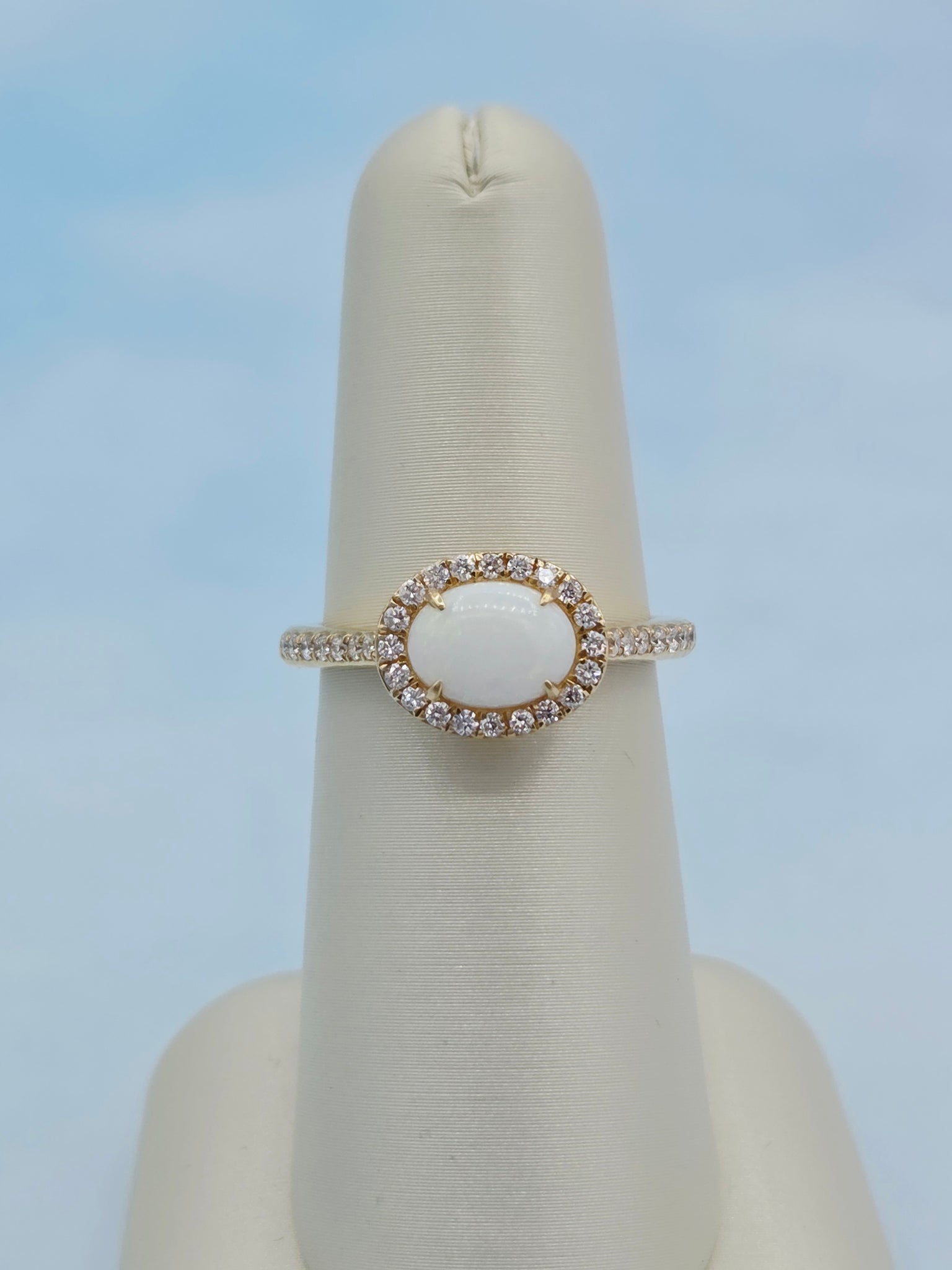 This ring features an .92 Oval Opal Stone with diamonds totaling .29 Carats.