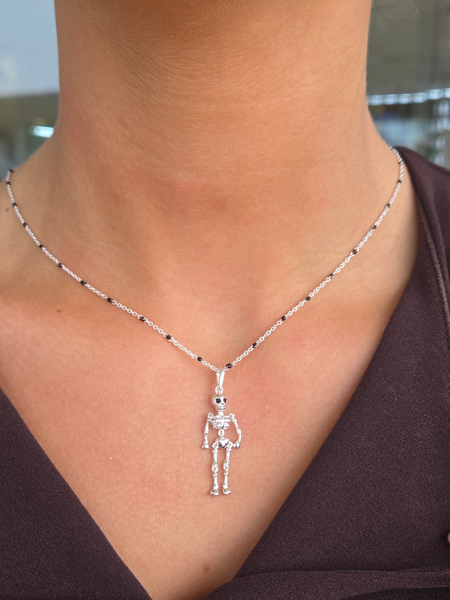 Elevate your Halloween style with this spooky-chic necklace! The silver chain features a playful skeleton pendant that dangles with a touch of eerie elegance. Jet black glass beads add a mysterious flair, making this necklace the perfect accessory for adding a bit of ghoulish glam to your look.