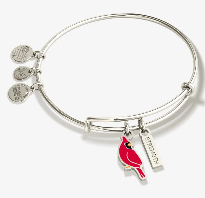 - Cardinals are often seen as messengers of love, strength, and remembrance. This expandable bangle features a vivid red epoxy cardinal charm and a secondary charm engraved with the word "Strength"—a powerful reminder of inner resilience and the presence of loved ones past. Designed to honor enduring bonds, it’s a thoughtful piece for anyone navigating grief, healing, or growth. Expandable from 2" to 3.5". Shiny silver finish.