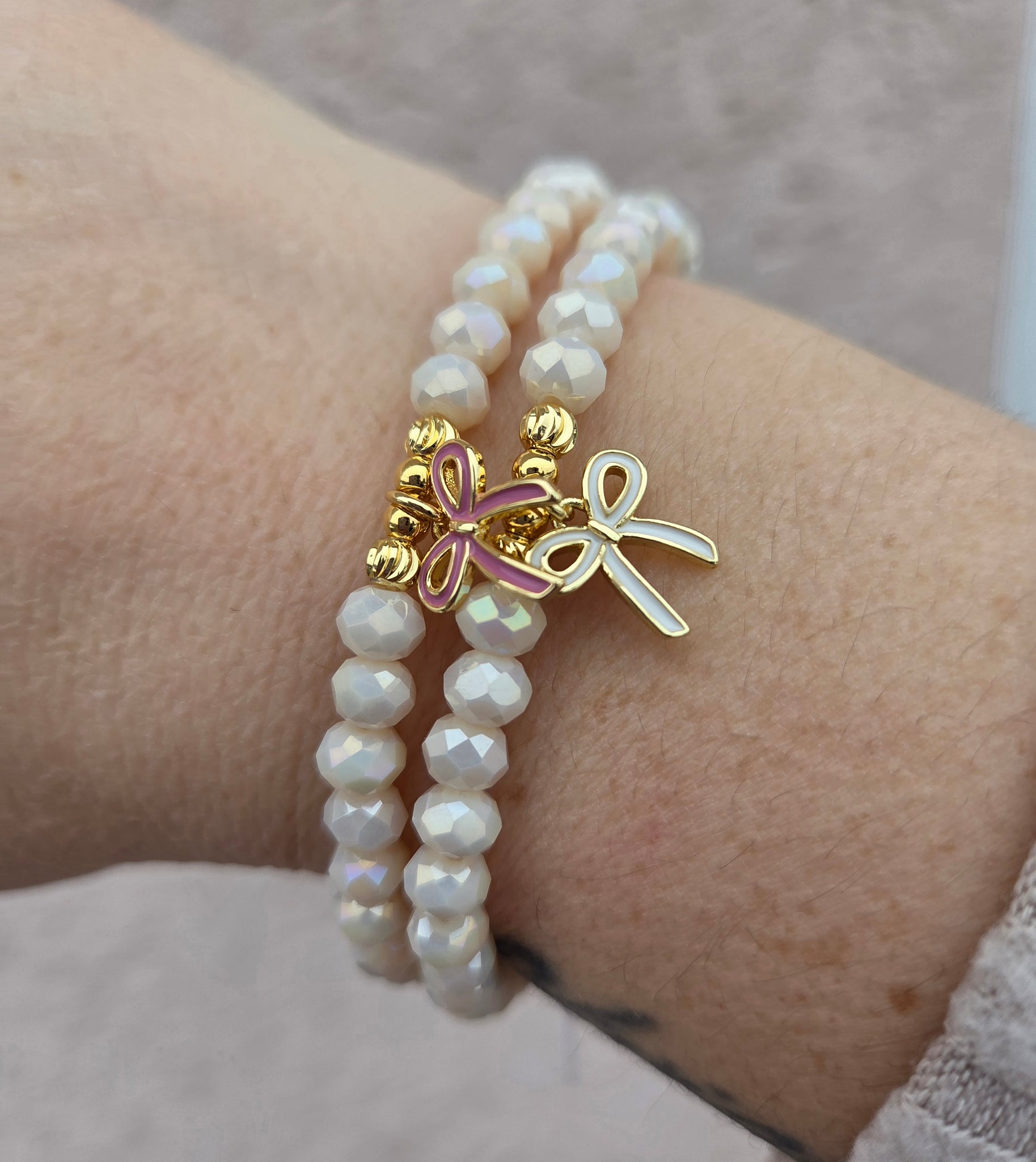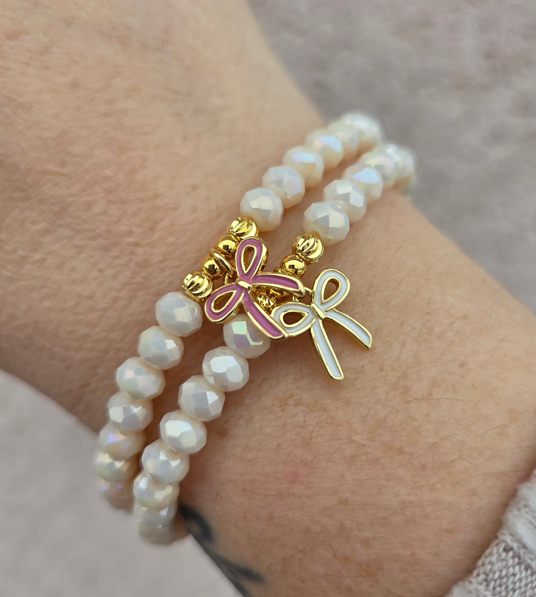 Enamel Bow on Cream Puff Shimmer Beaded Bracelet - Elena Michele