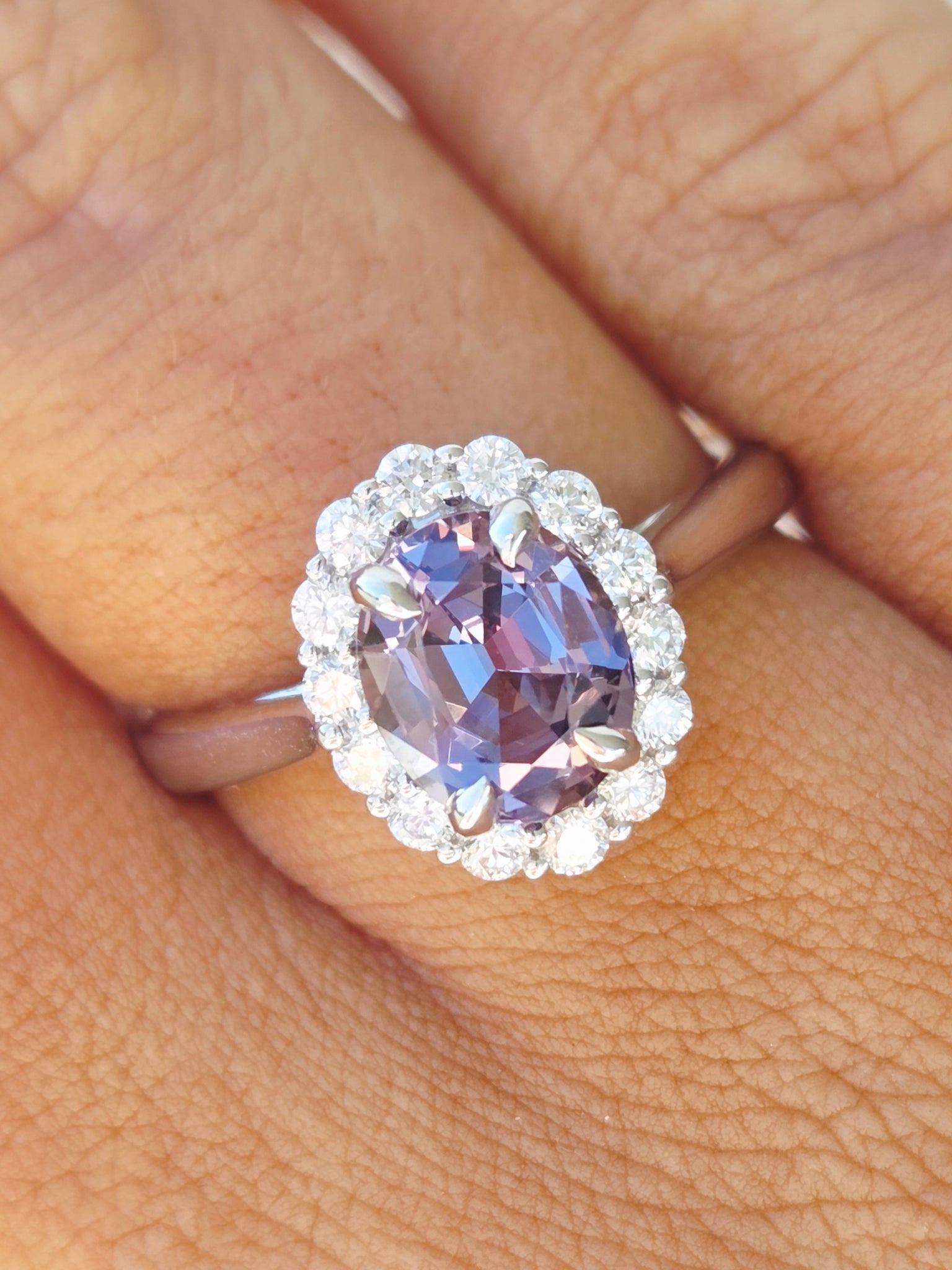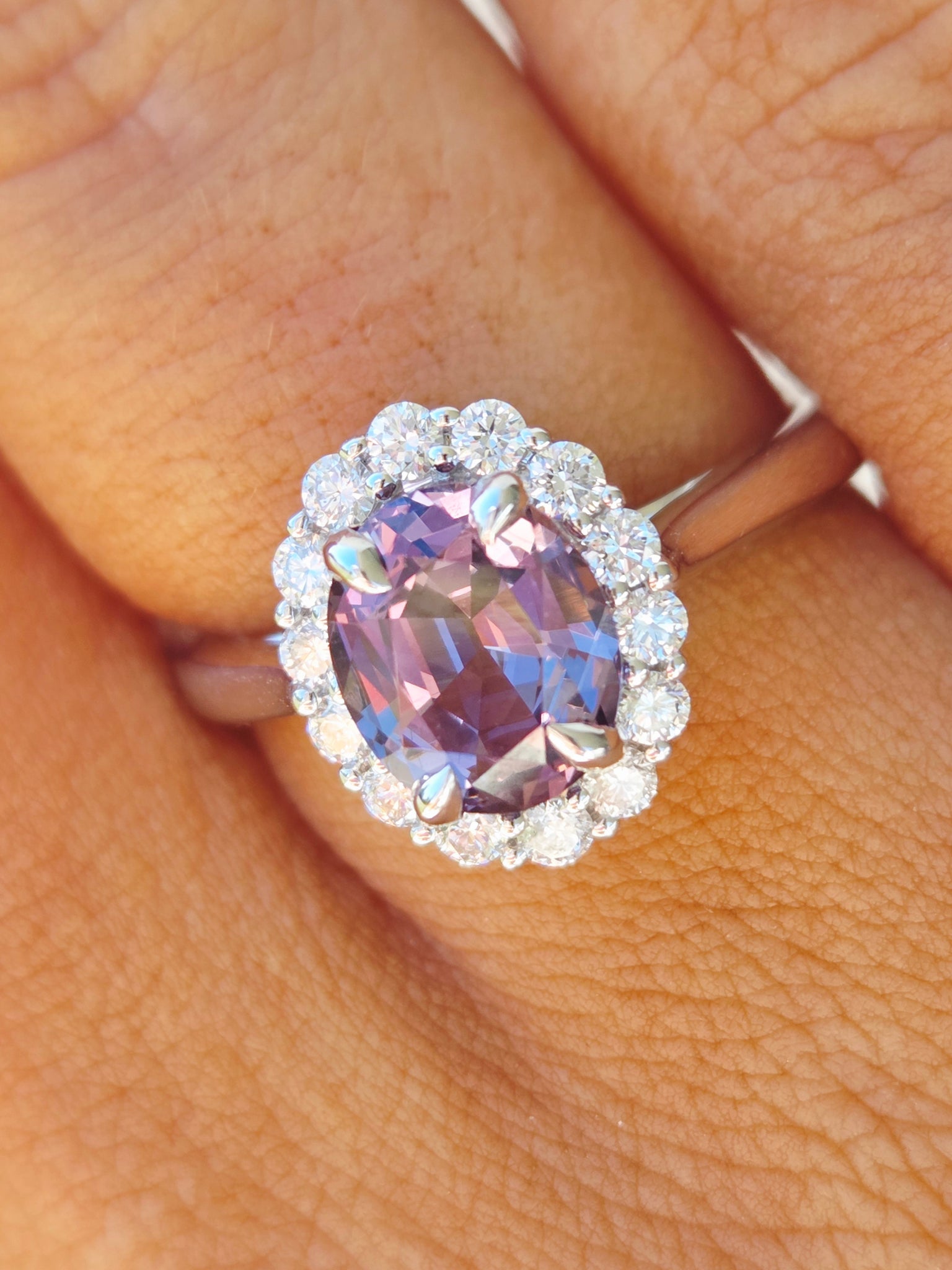 A stunning. one-of-a-kind Spinel stone with a diamond halo.