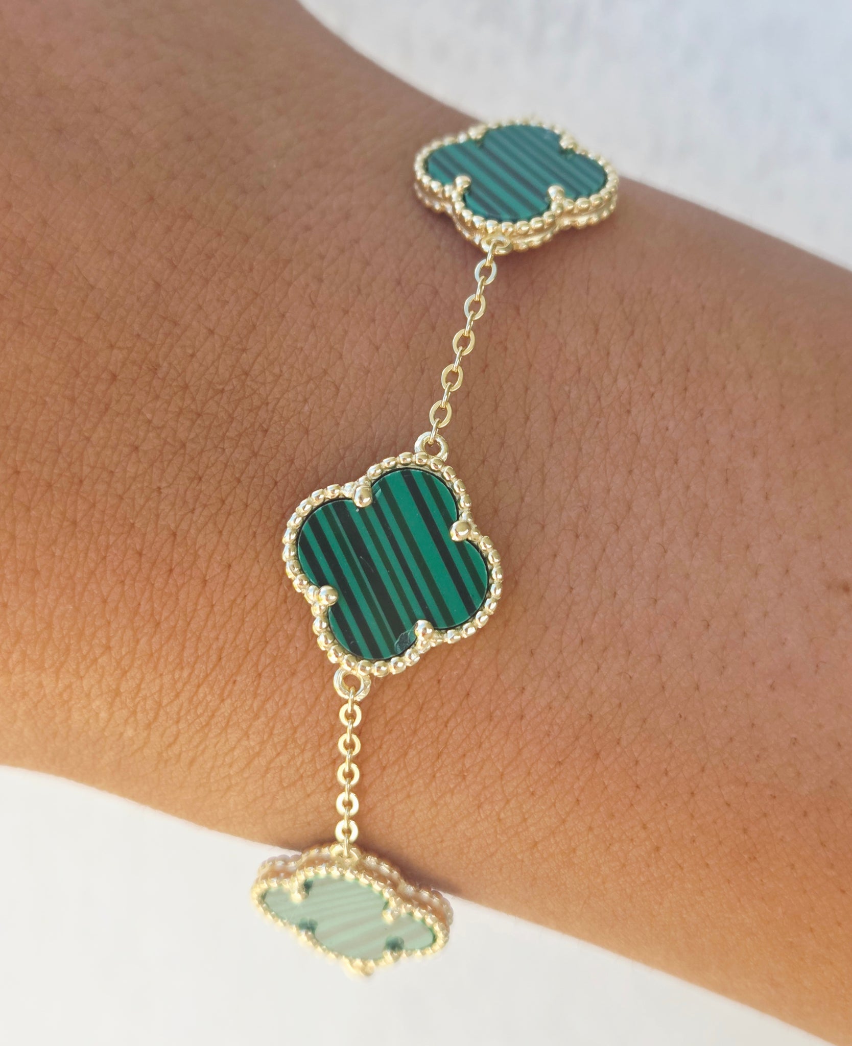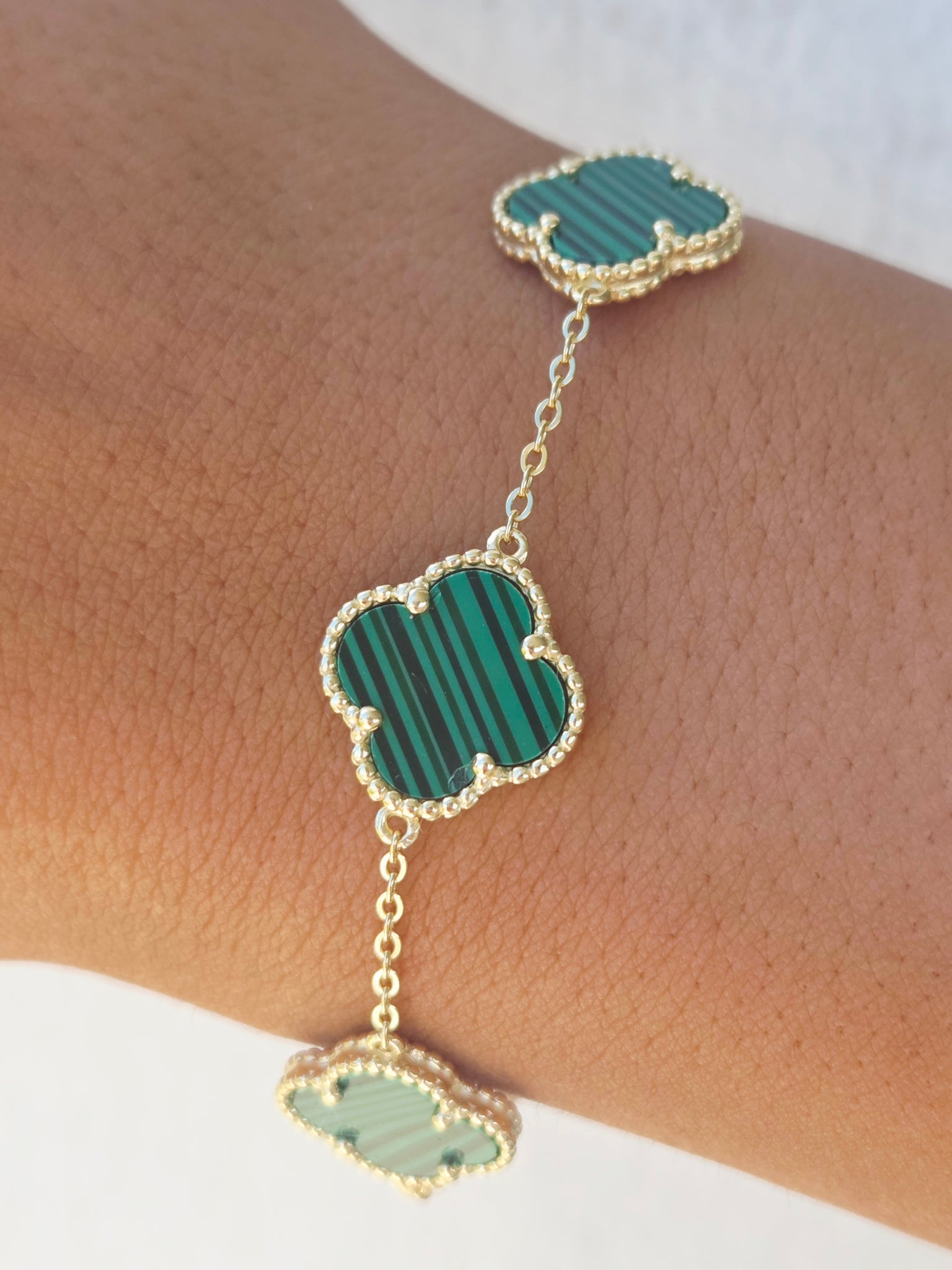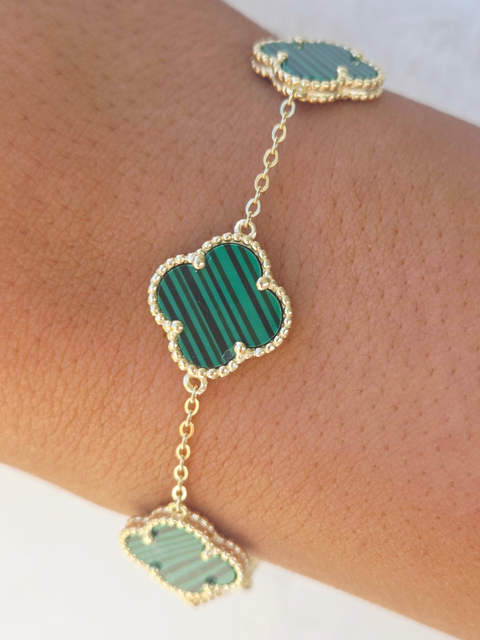 7" gold plated Malachite clover bracelet
