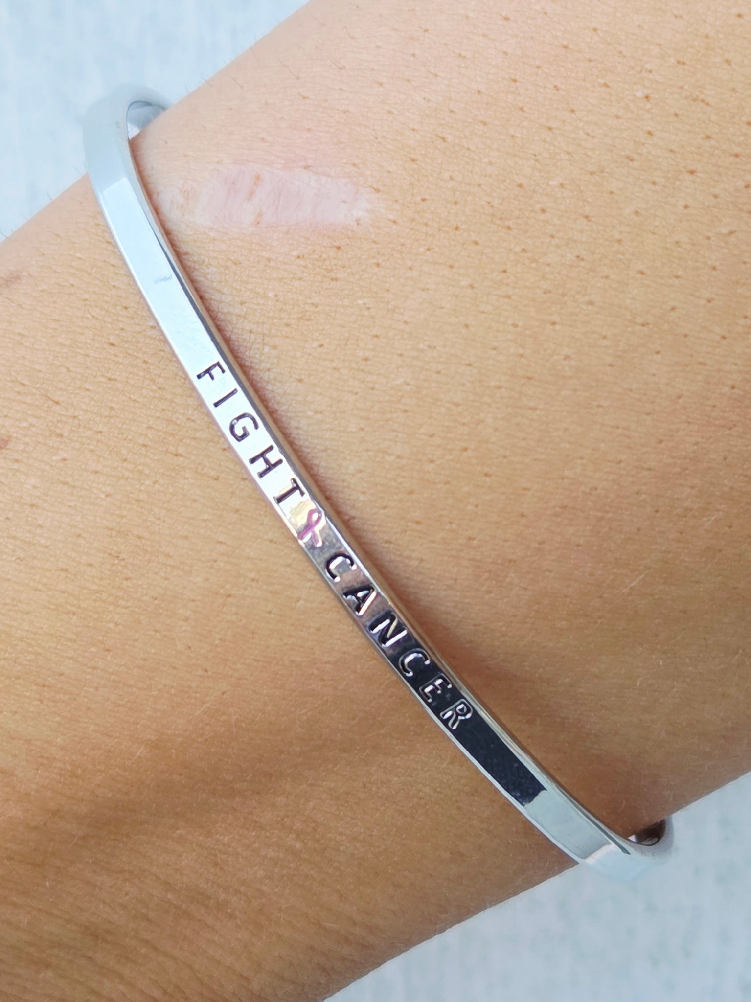 This Bangle Reads "Fight Cancer" with a Pink Ribbon in between the words.