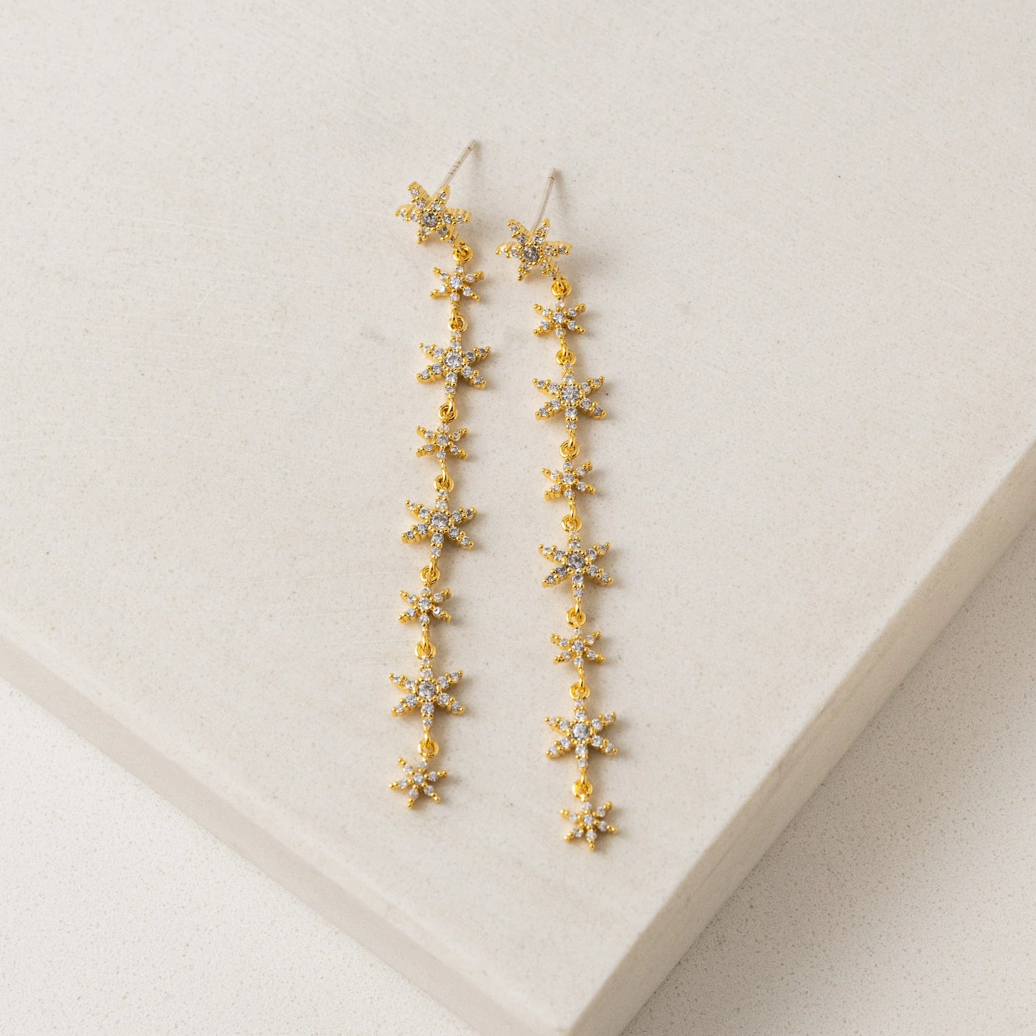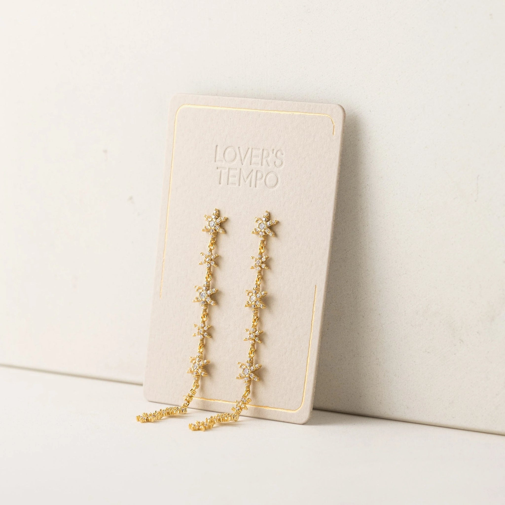 A swinging galaxy of sparkle. Statement earrings created from a string of tiny stars that’ll have you beaming from ear to ear.