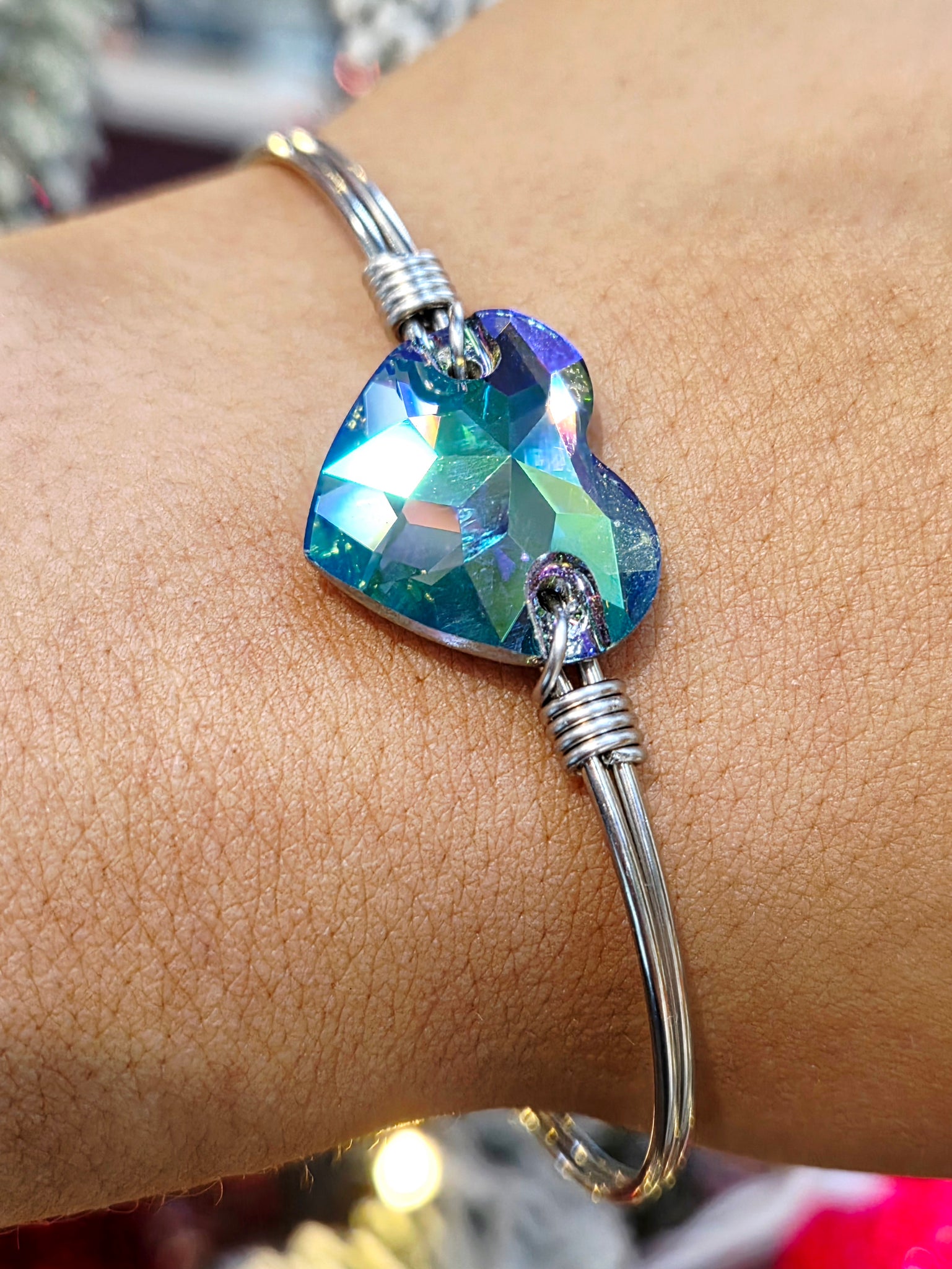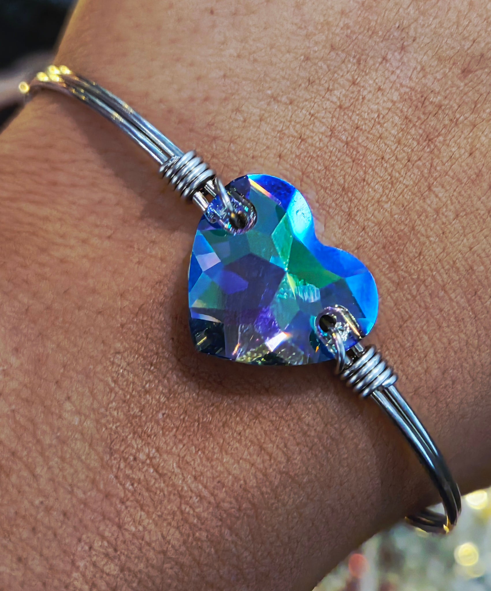 The Swarovski heart shows colors purple, green and blue and the bangle is available in silver or gold.