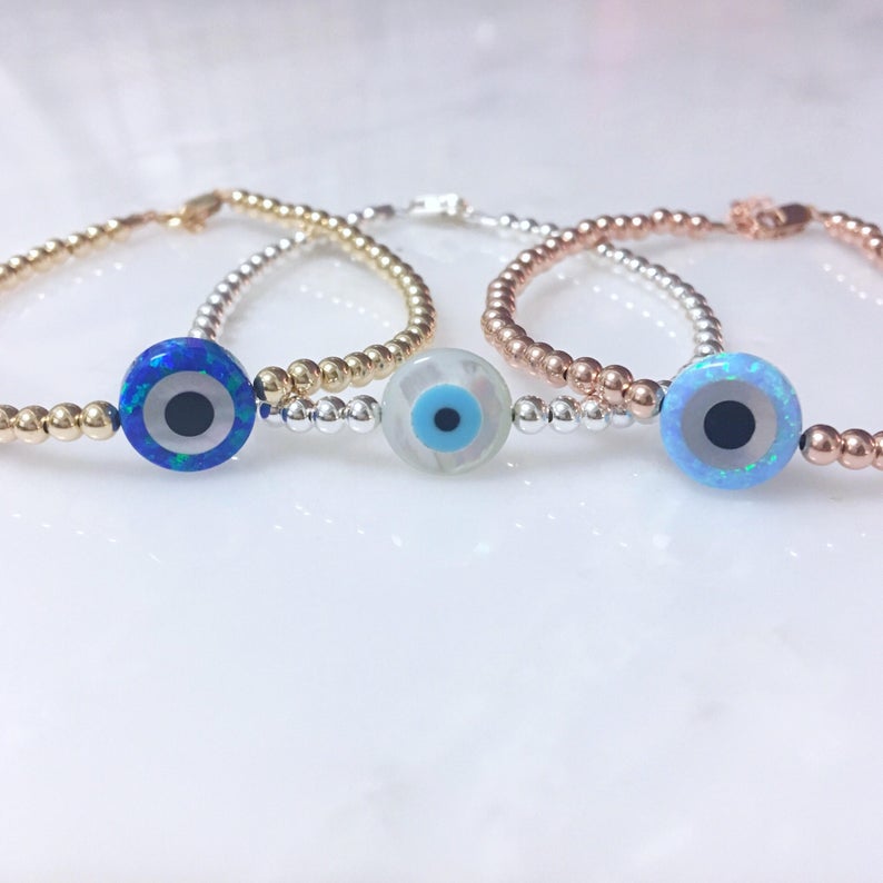 Wearing an evil eye is said to ward off harm and bring protection. This beautiful bracelet comes in three opal choices: dark blue, light blue, or white (made of mother of pearl). Also choose between gold-filled, rose gold-filled, and sterling silver finishes. One inch of extra chain lets you adjust the bracelet to your preference. All items are hand-made in the USA in a smoke-free studio, and most importantly, they're made with OurWholeHeart❤︎