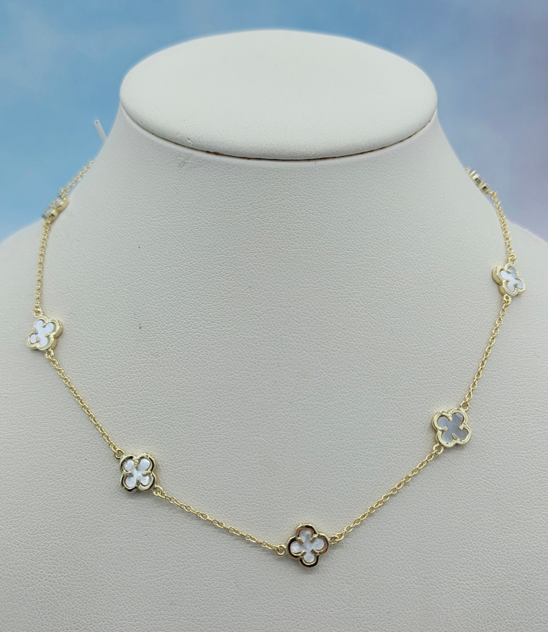 Mother of Pearl clovers by the yard on an adjustable sterling silver, gold fill or rose gold fill necklace.