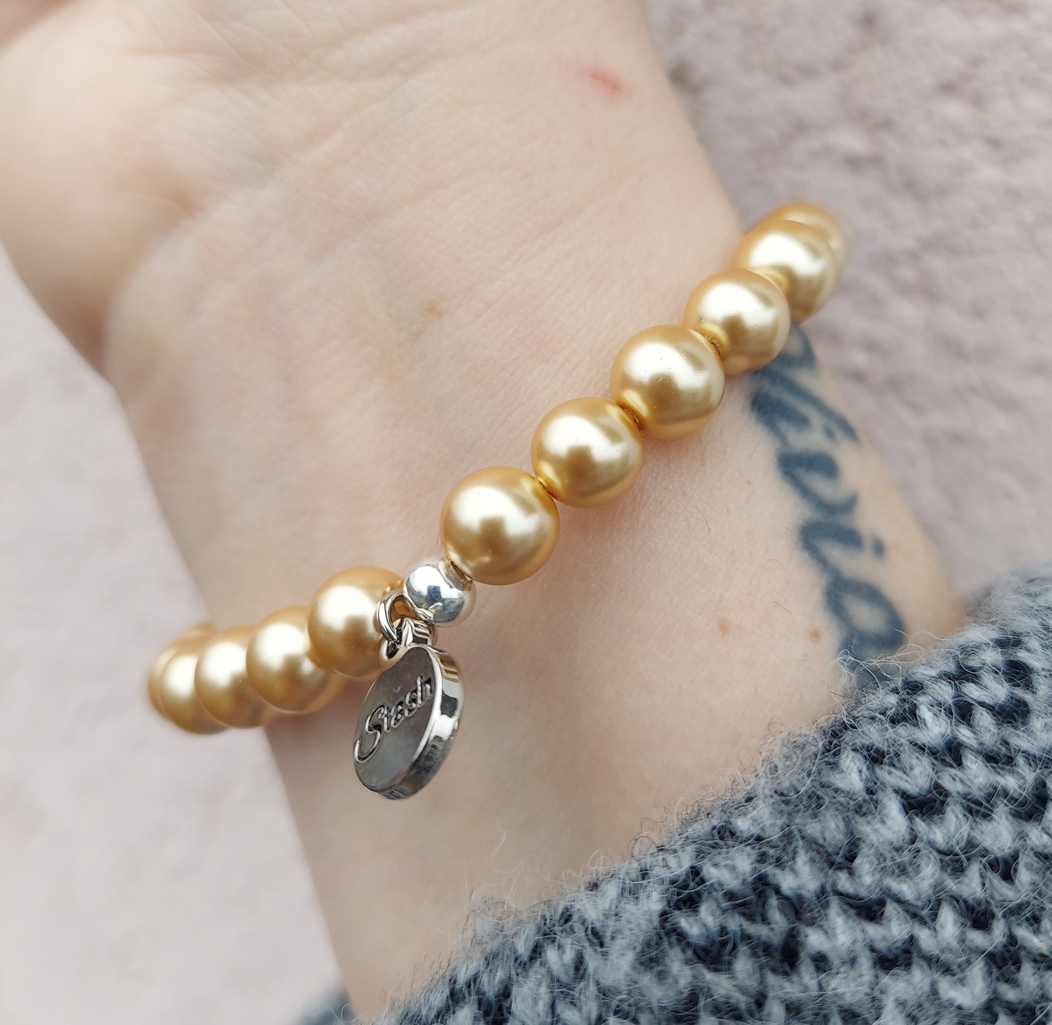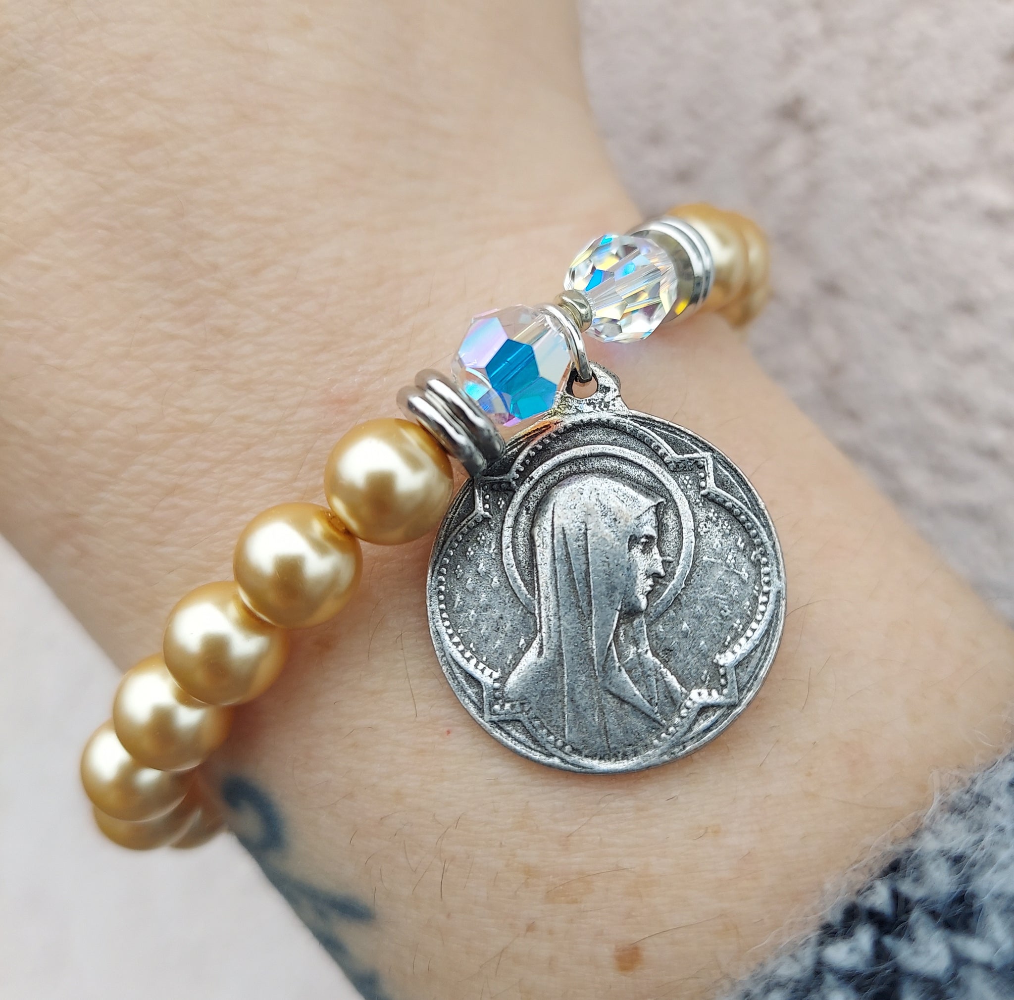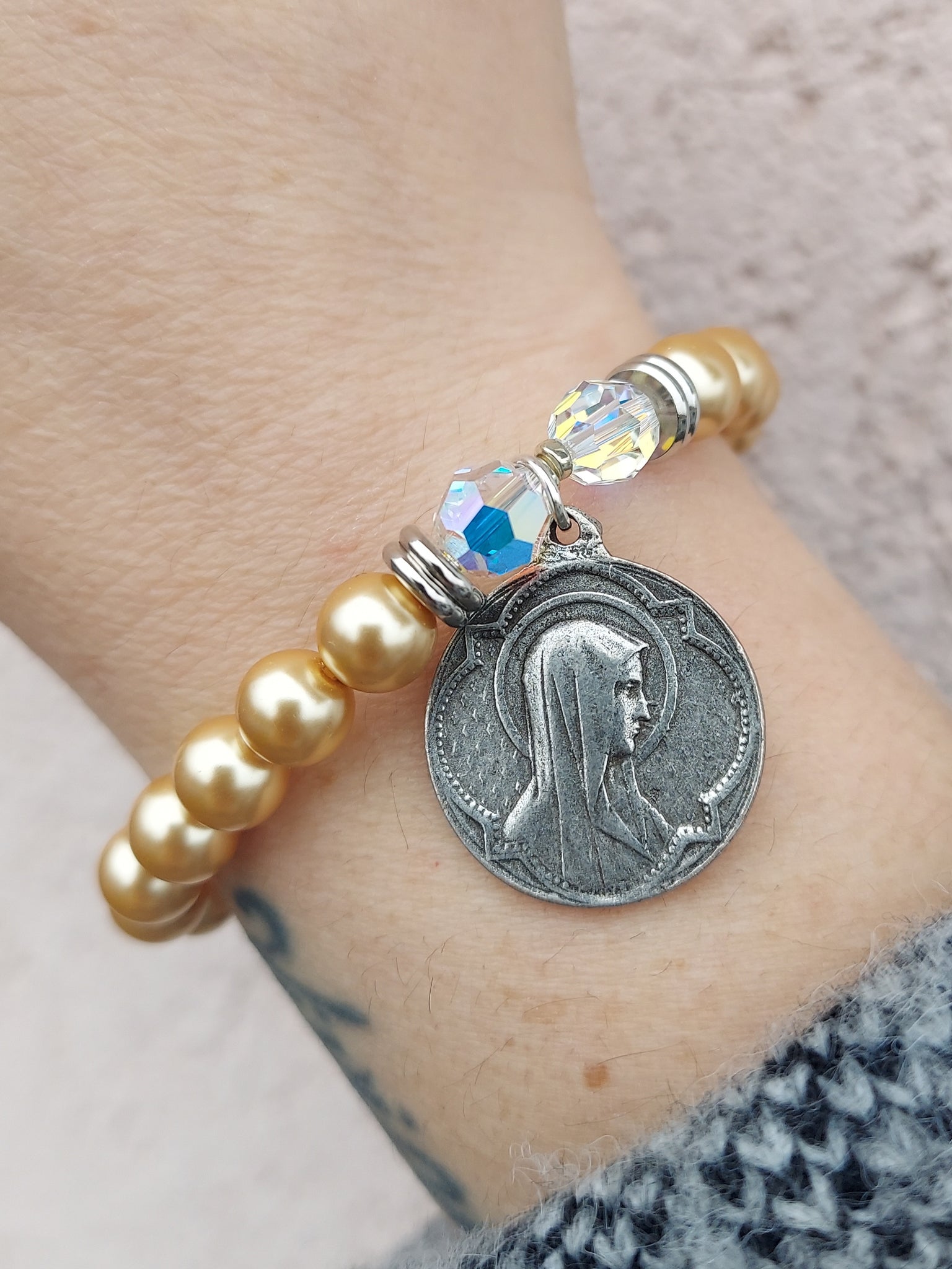 Mother Mary Round Medal on Champagne Pearl - Religious Stash Bracelet