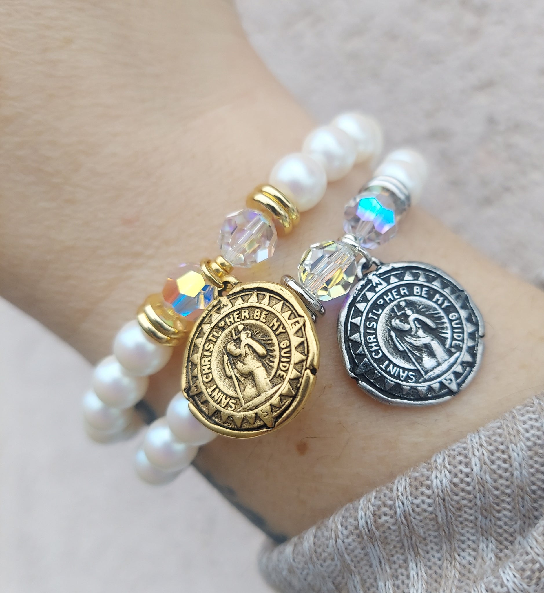 St. Christopher on White Pearl - Religious Stash Bracelet
