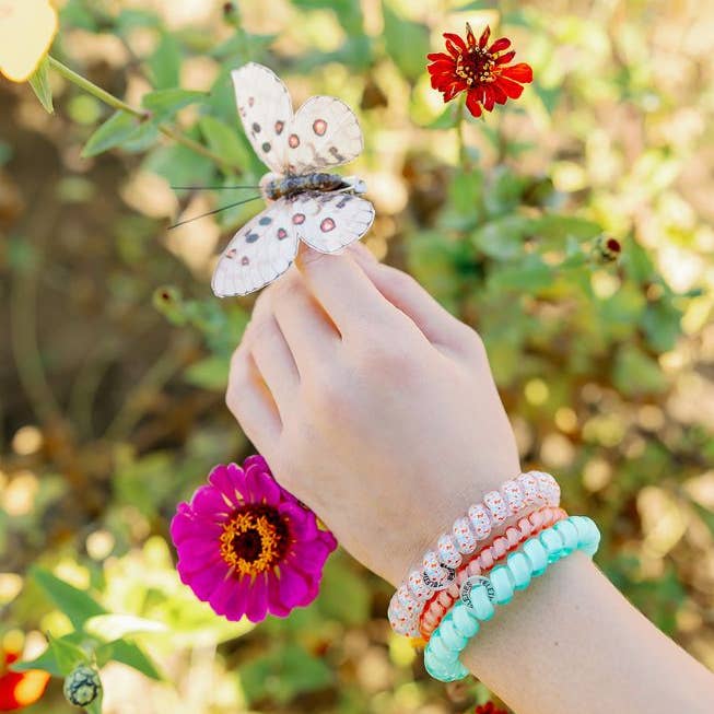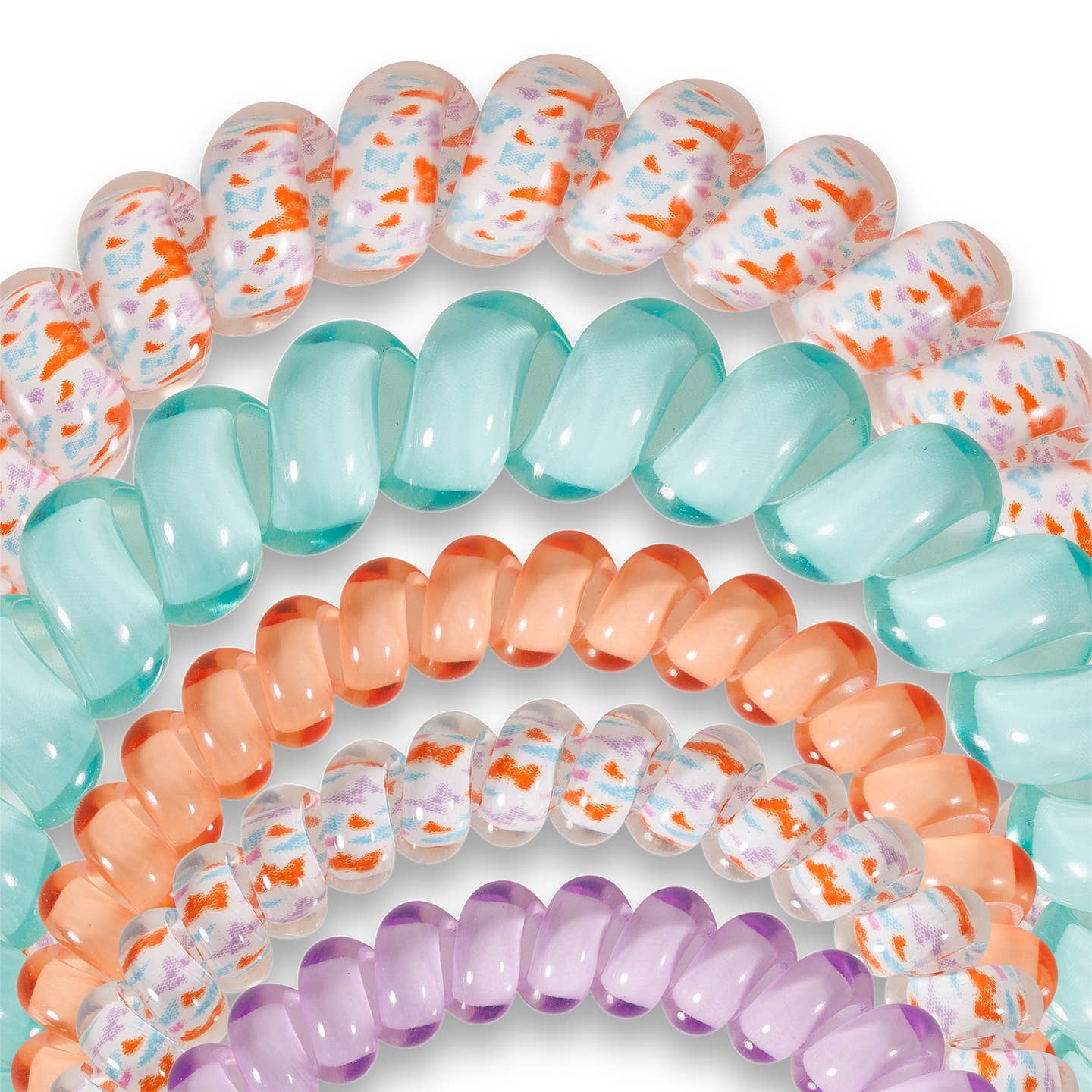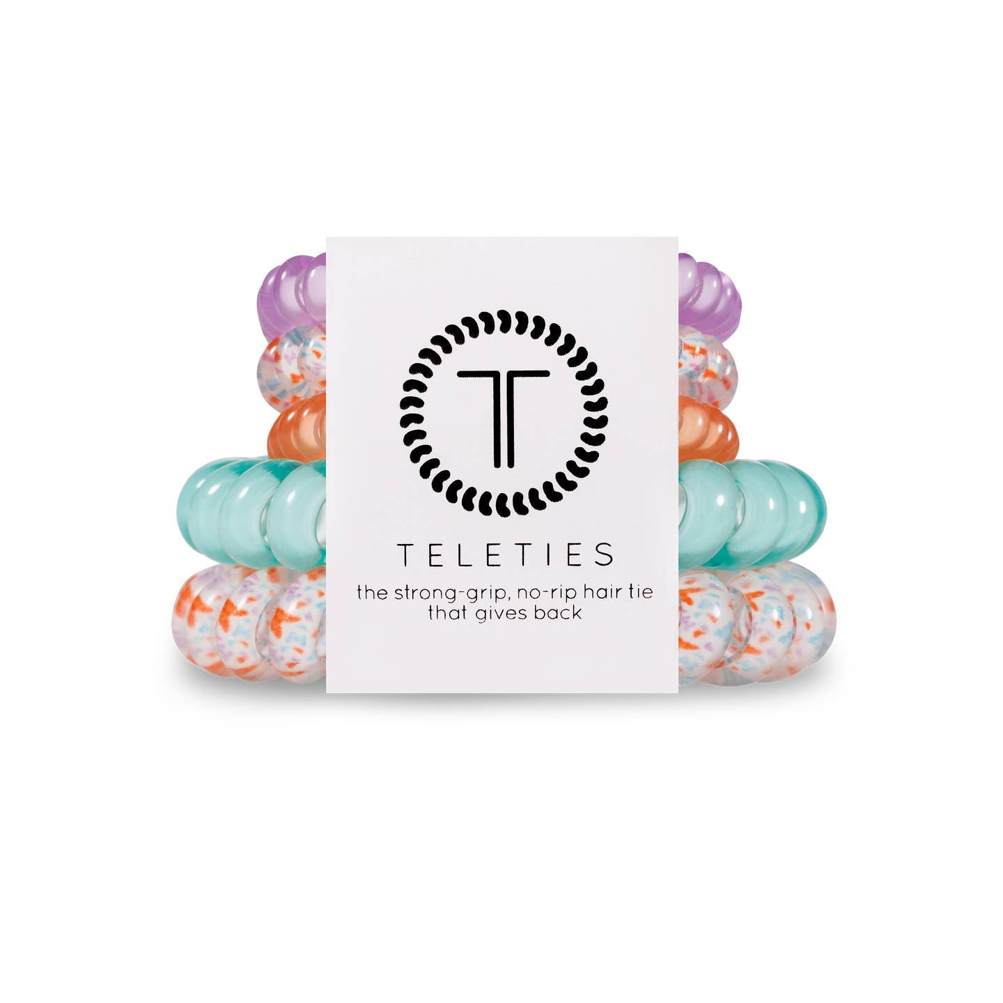 Hold your hair and enhance your style with TELETIES. The strong grip, no rip hair ties that double as a bracelet. Strong, pretty and stylish, TELETIES are designed to withstand everyday demands while taking your look to the next level. This five pack includes 3 smalls and 2 larges.