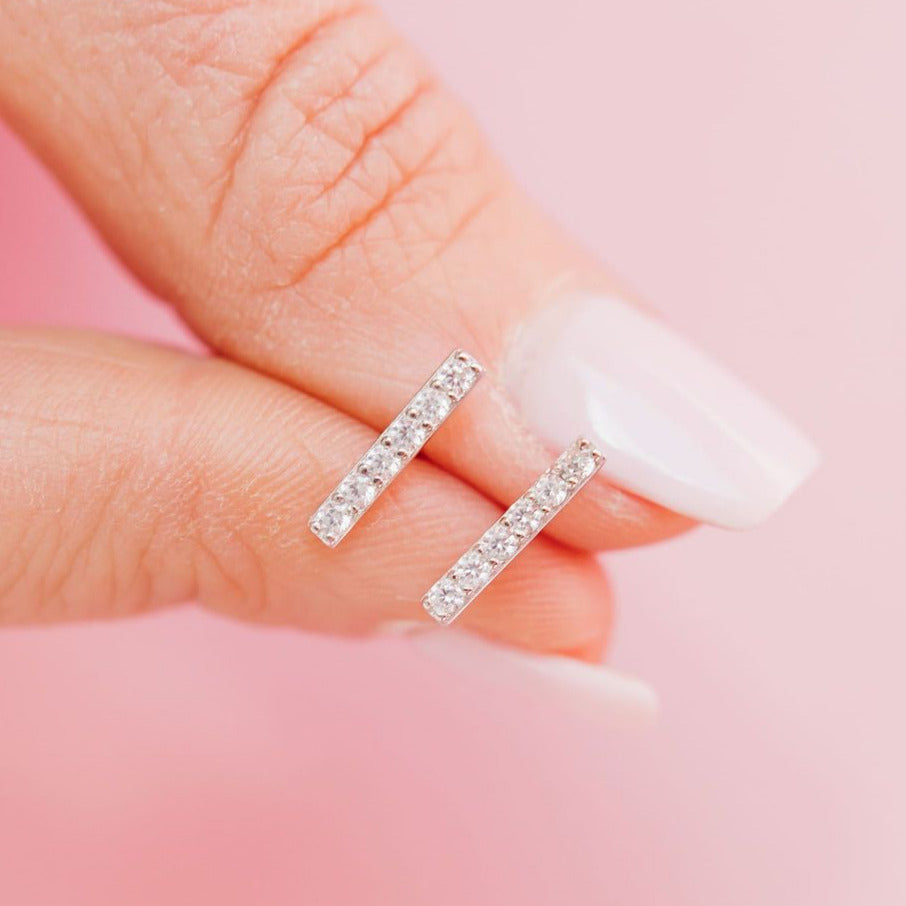 Dainty bar earrings with glittering, pavé set cubic zirconia detail. These studs are simple, yet highly fashionable and sparkle from every angle. They're perfect for everyday wear and are a Clo + Lo fav favorite!