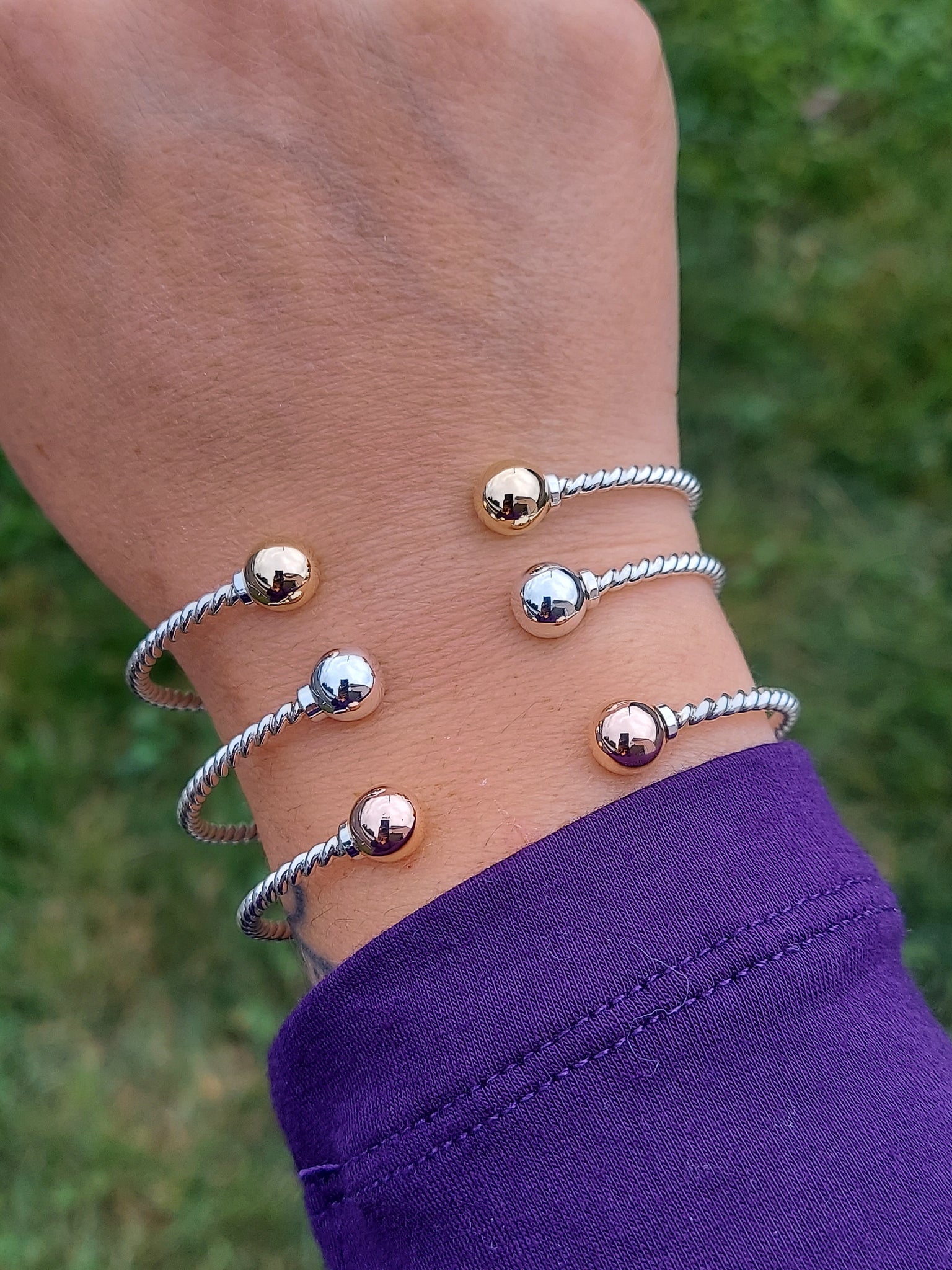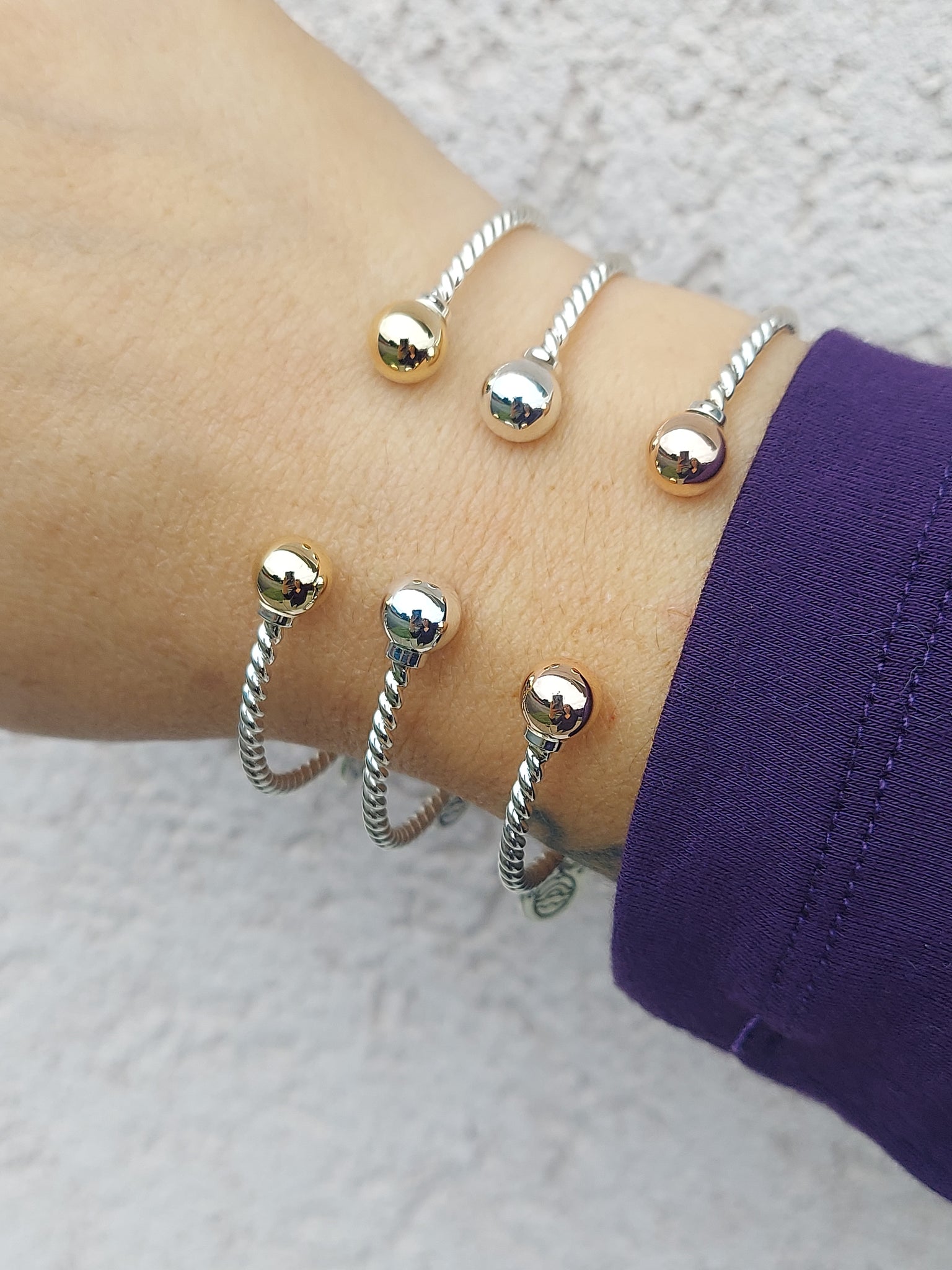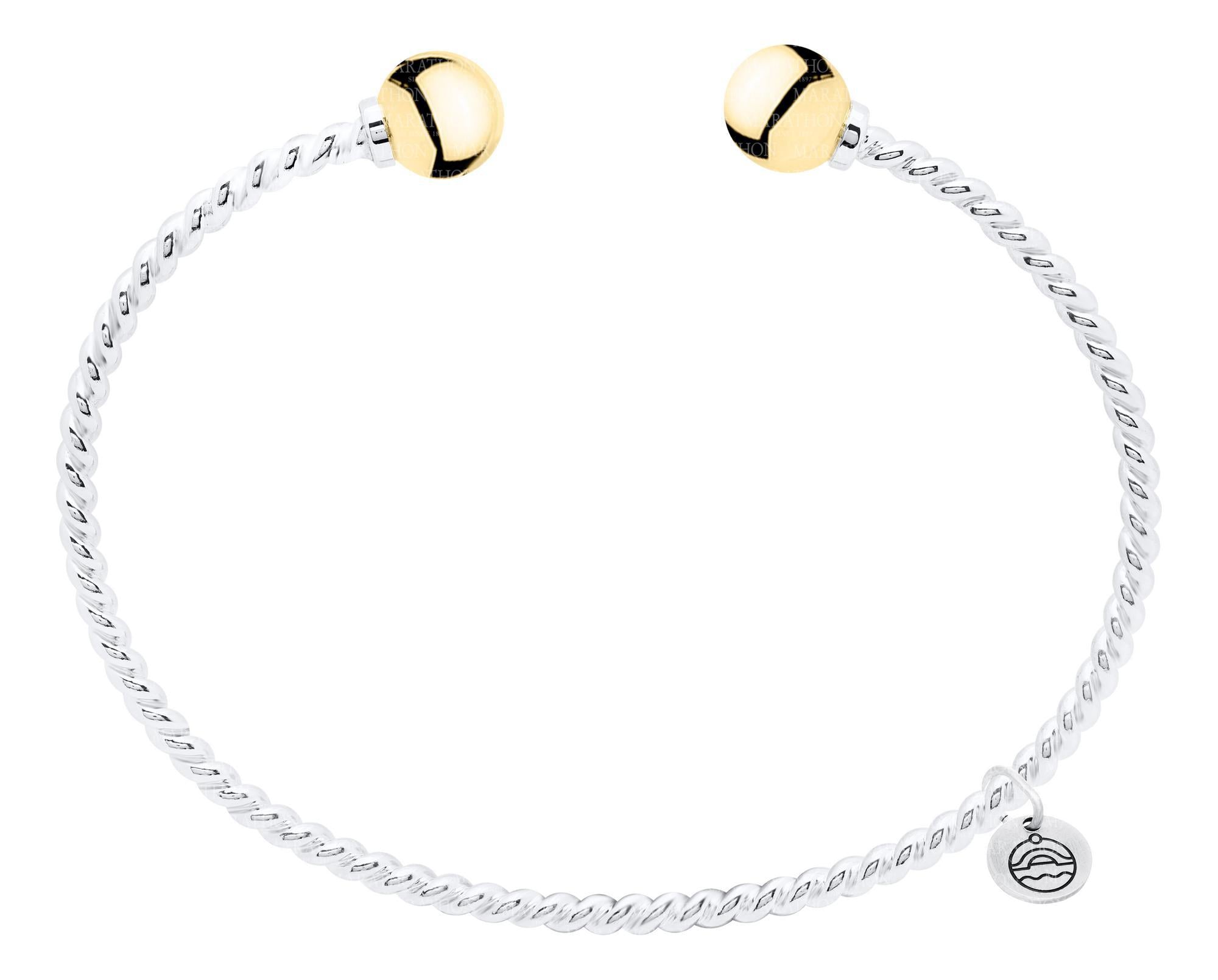 This gorgeous cape cod cuff has a twisted design with a 14k Yellow Gold bead on each end.