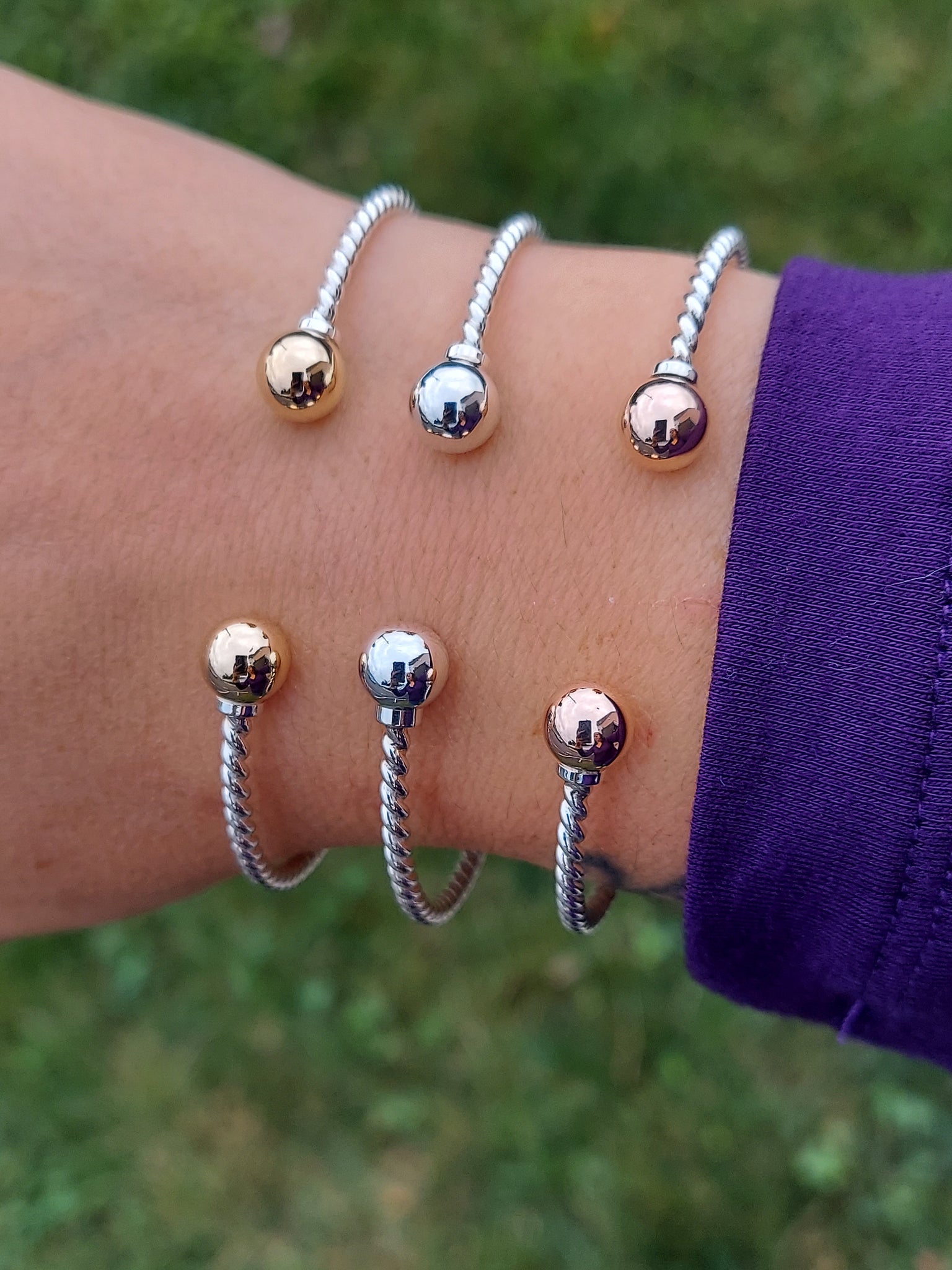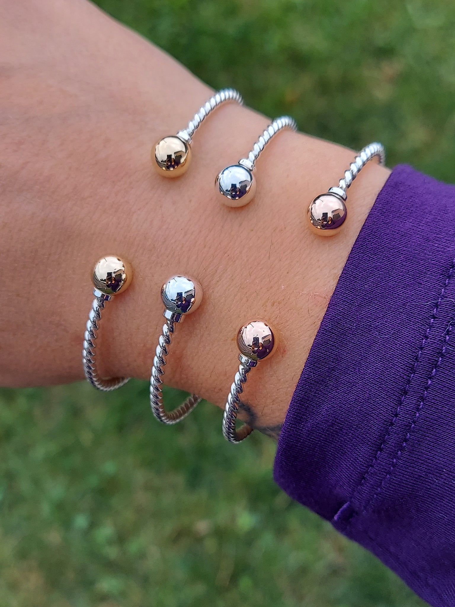 This gorgeous cape cod cuff has a twisted design with a sterling bead on each end.