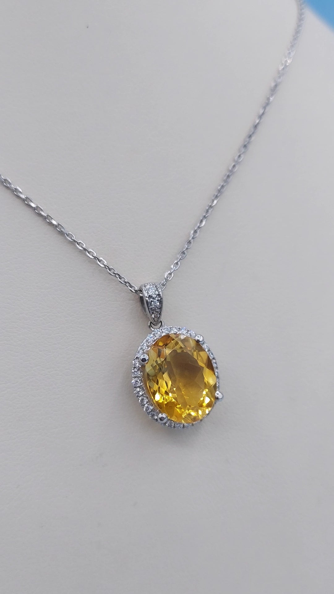 A stunning oval citrine surrounded by a halo of diamonds.