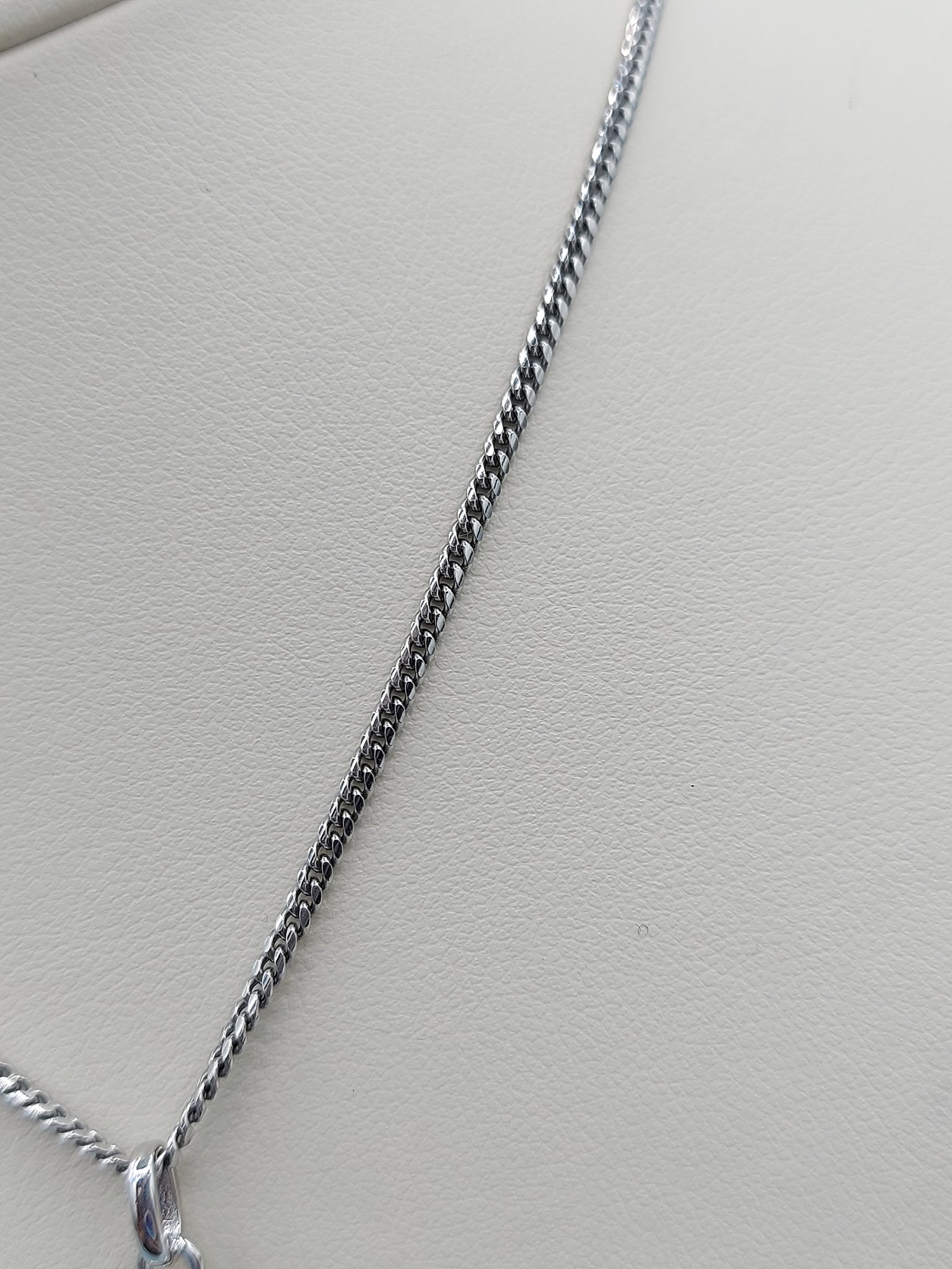 This chain is rhodium plated and 18" long. The cross is 1.5" long including the bale.