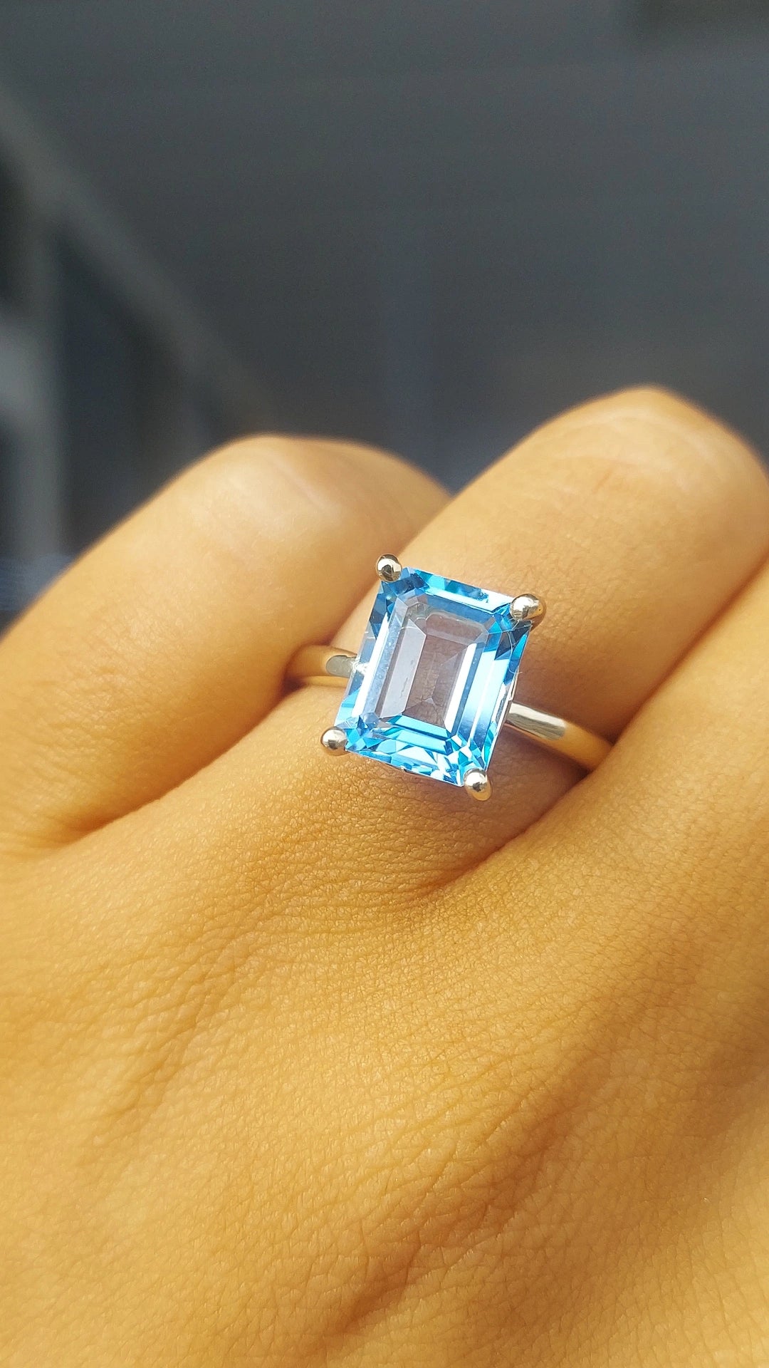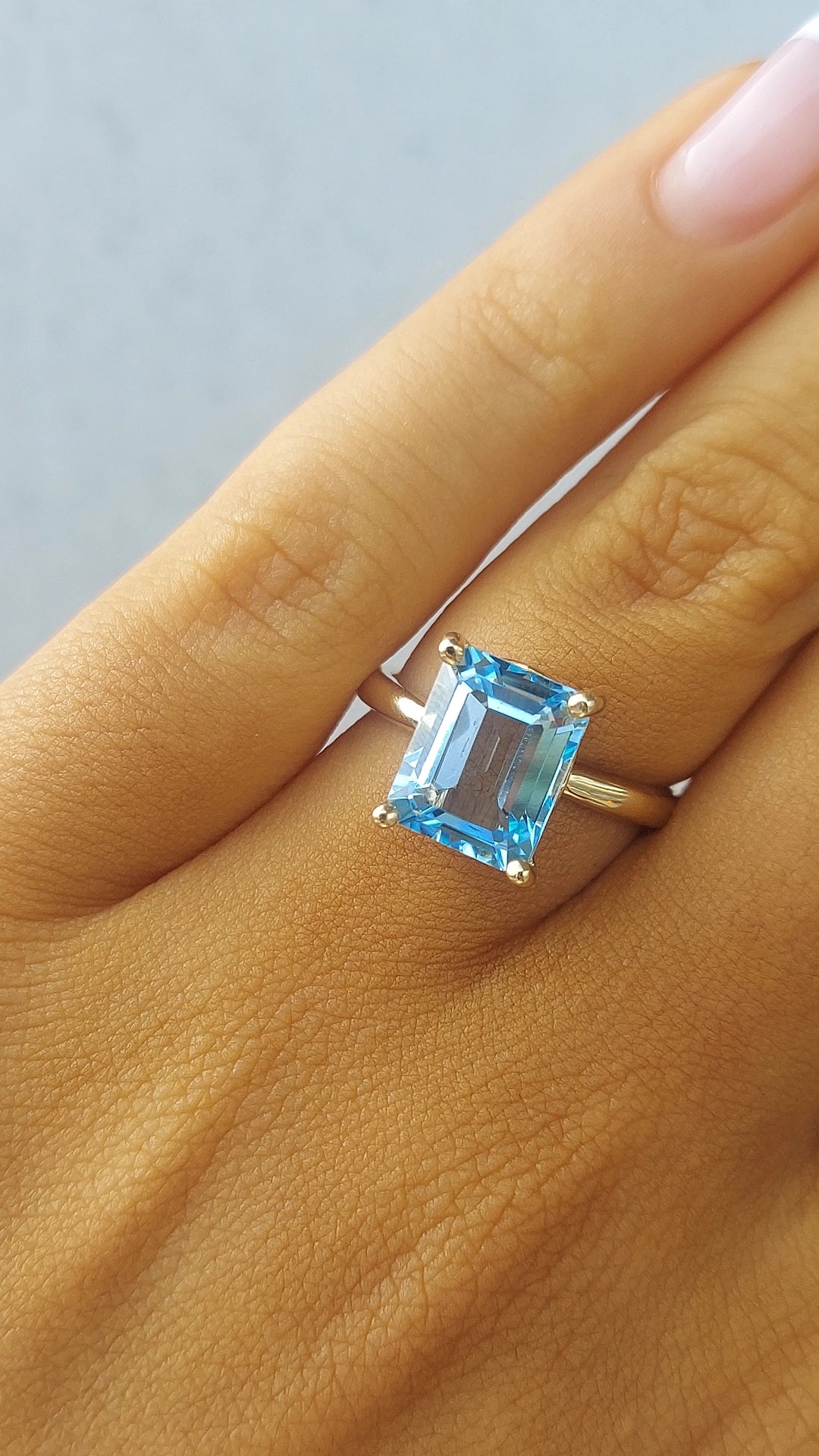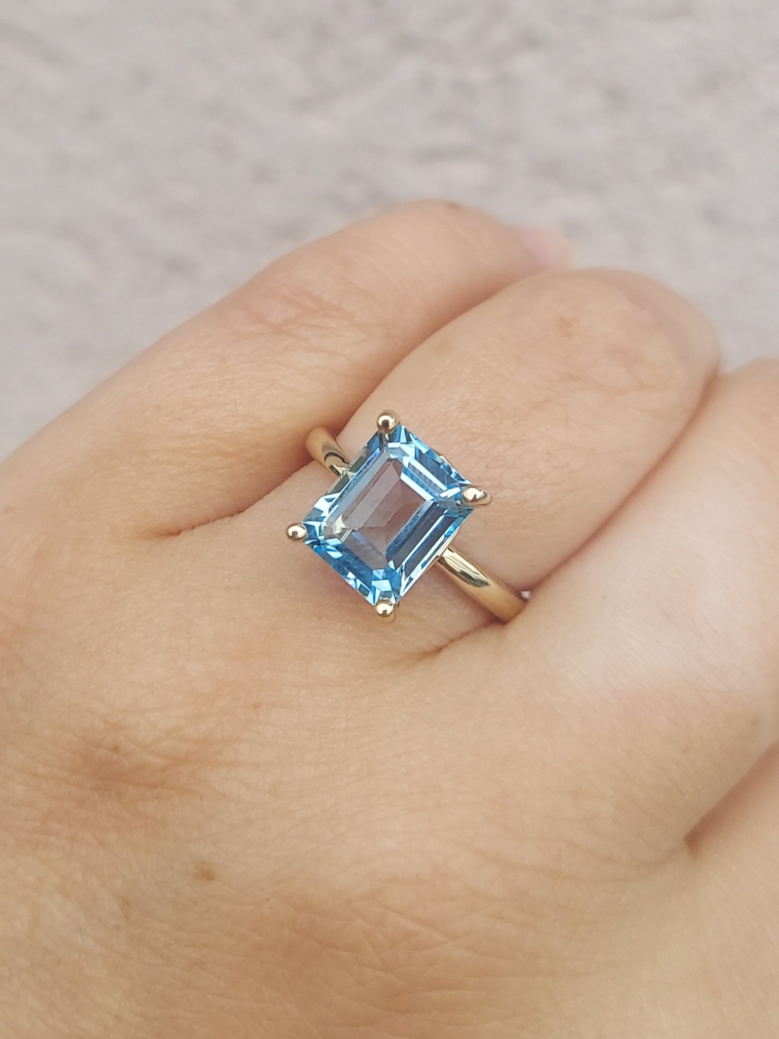 Emerald-cut blue topaz stone set in a 14K Yellow Gold ring with a unique crown setting.