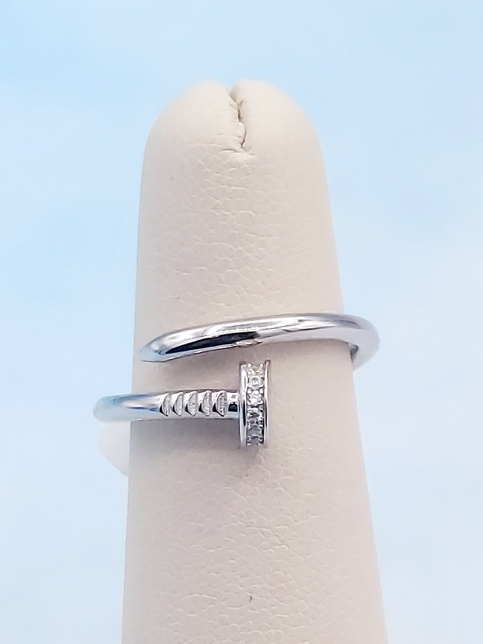 This sterling silver ring is a wrapped CZ nail. We call it the "Tough as Nails" Ring. Adorned with Cubic Zirconia Stones.